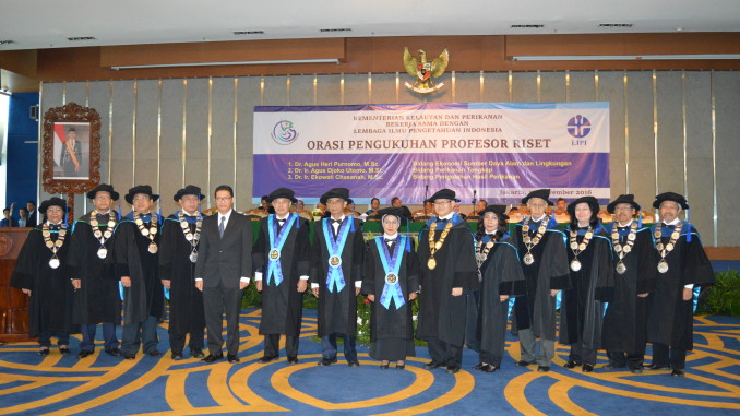 Jakarta, Selasa (22/11), Hanya berselang dua belas hari setelah mengukuhkan Profesor Riset Lembaga Penerbangan dan Antariksa Nasional (LAPAN) yang bertepatan dengan Hari Pahlawan yang lalu, kali ini (Selasa, 22/11) LIPI kembali mengukuhkan tiga orang Profesor Riset dari Kementerian Kelautan dan Perikanan, yaitu Prof. Dr. Agus Heri Purnomo, M. Sc., bidang Ekonomi Sumber Daya Alam dan Lingkungan, Prof. Dr. Agus Djoko Utomo, M.Si., bidang Perikanan Tangkap, dan Prof. Dr. Ekowati Chasanah, M.Sc., bidang Pengolahan Hasil Perikanan, bertempat di di Ballroom Gedung Mina Bahari 3, Jl. Merdeka Timur No. 16 Jakarta Pusat.