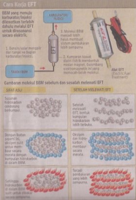 Electric Fuel Treatment (EFT) adalah merupakan alat untuk meningkatkan sifat bahan bakar menjadi lebih efisien pada berbagai kendaraan bermotor dengan menggunakan prinsip Electrical Magnetic Resonance. Dengan menggunakan alat ini BBM (baik solar ataupun bensin yang menuju ke sistem saluran karburator/injeksi diresonansikan secara elektris, sehingga terbentuk molekul-molekul BBM yang tingkat energinya lebih besar dibanding sebelumnya. Dengan demikian EFT dapat menghasilkan kalor BBM yang lebih sempurna, dan telah didaftarkan pada Ditjen Paten HKI RI No. P00200400434