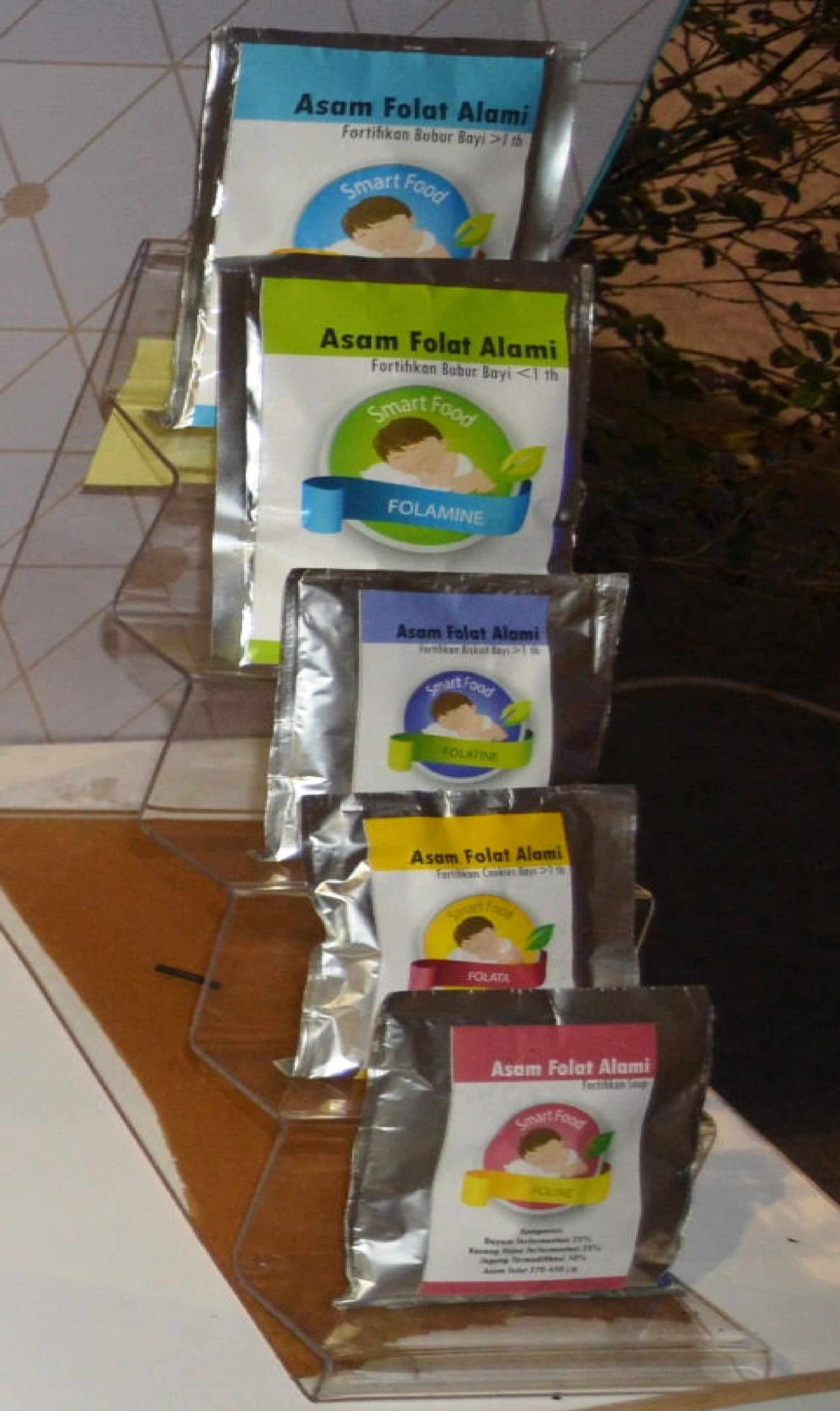 Formulasi pangan pintar dengan asam folat untuk bayi dan balita berasal dari fermentasi sayur-sayuran seperti brokoli dan bayam, fermentasi kacang-kacangan seperti kacang kedelai, kacang hijau dan kacang merah, ditambah modifikasi dari pati jagung.