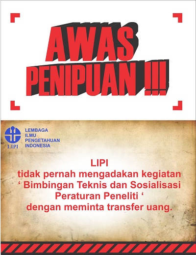 (Jakarta – Humas LIPI). Lembaga Ilmu Pengetahuan Indonesia (LIPI) mengimbau masyarakat umum agar mewaspadai peredaran undangan kegiatan bimbingan teknis dan sosialiasi palsu yang mengatasnamakan LIPI. “Surat Undangan Bimbingan Teknis dan Sosialiasi nomor 5972/WK/UM-LIPI/IV/2-15 tertanggal 25 Maret 2015 adalah palsu,” ungkap Wakil Kepala LIPI Dr. Akmadi Abbas di Jakarta pada Selasa (31/3) lalu. - -Surat undangan bertanda tangan Wakil Kepala LIPI t...